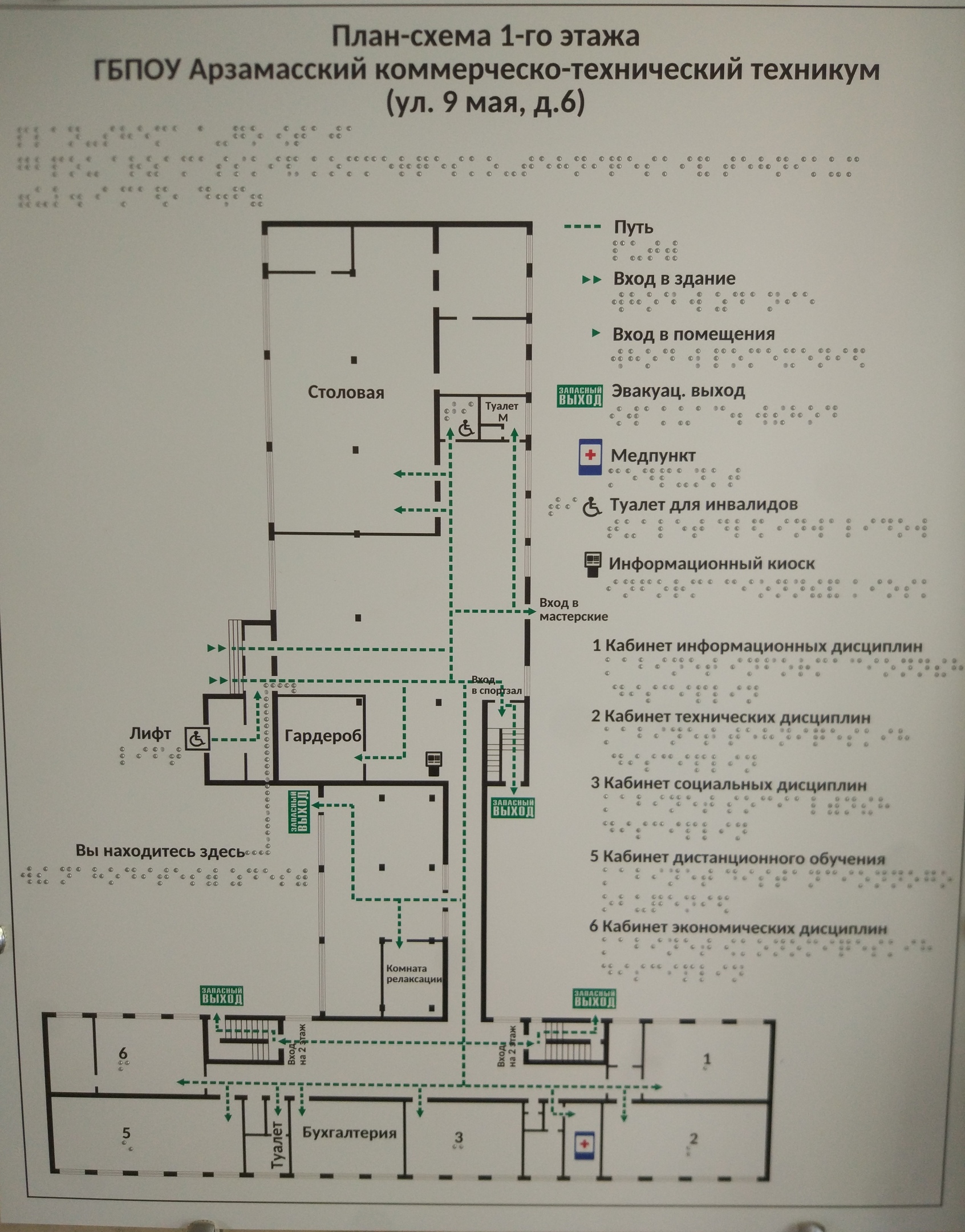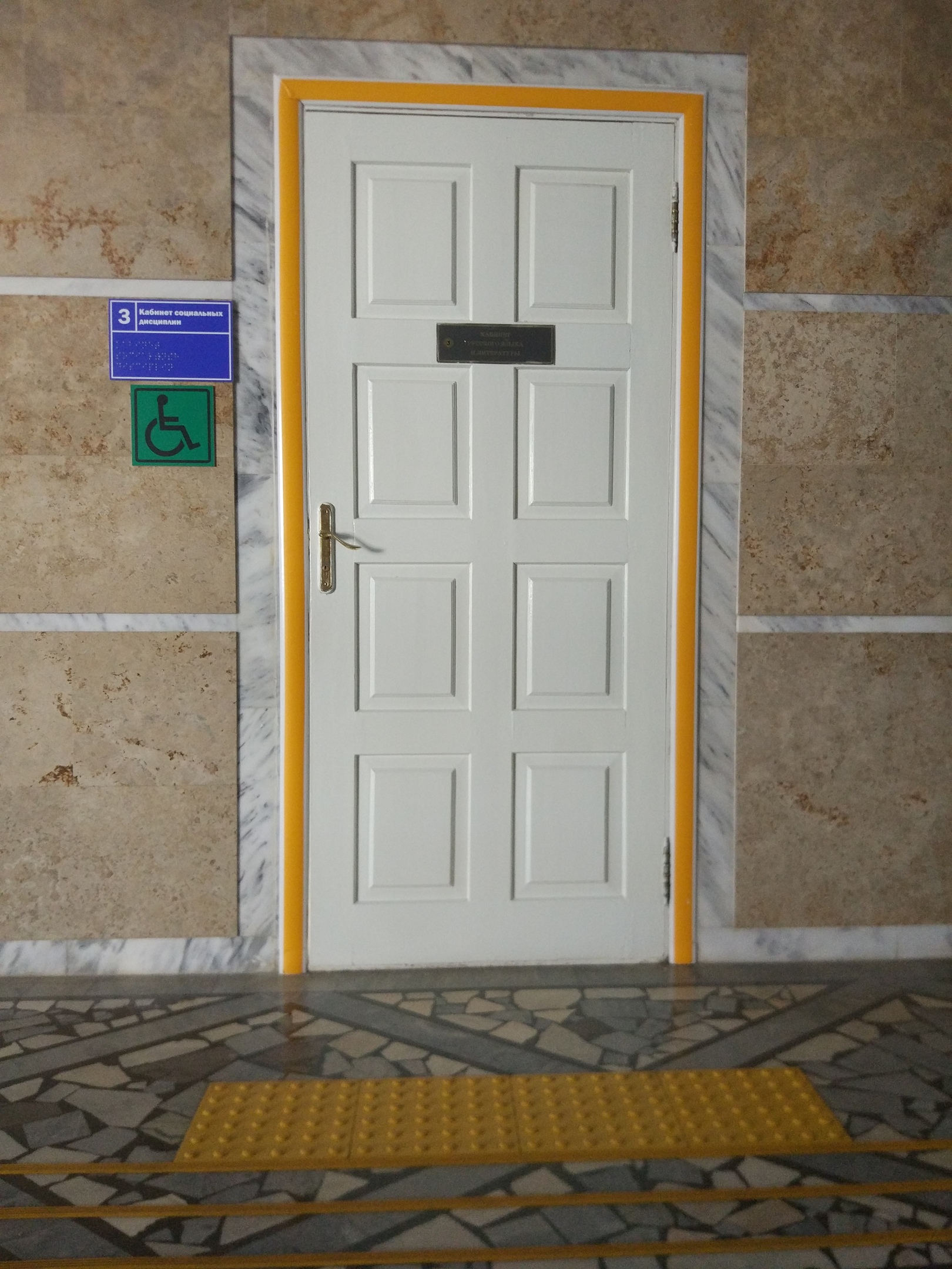 Все кабинеты и помещения техникума обозначены табличками контрастного желтого цвета с нанесением дублирующего текста шрифтом Брайля, что позволяет получить информацию о кабинете слабовидящими и тотально слепыми людьми тактильным способом.